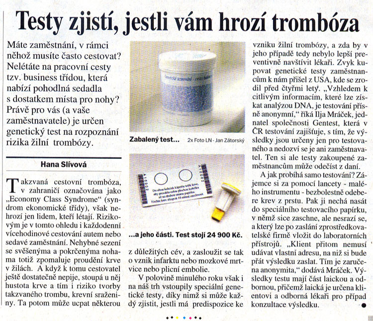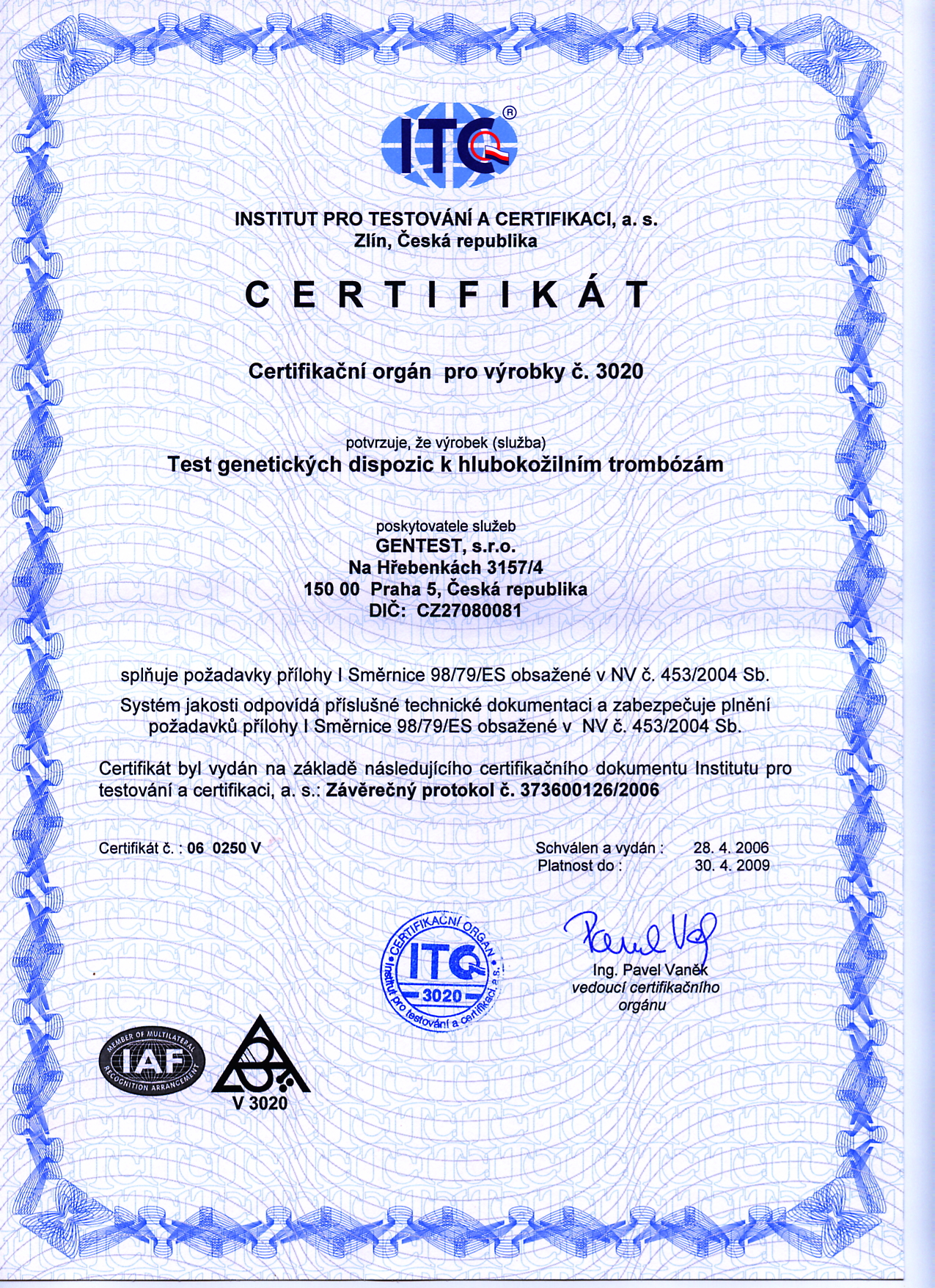 28.4.2006Nezávislá certifikační autorita, tzv. Notifikovaná osoba, vydala Certifikát stvrzující, že test genetických dispozic k hlubokožilním trombózám firmy GENTEST s.r.o. splňuje legislativní požadavků EU a doporučení WHO (tj. evropských směrnic č. 98/79/ES a č. 93/42/EHS).