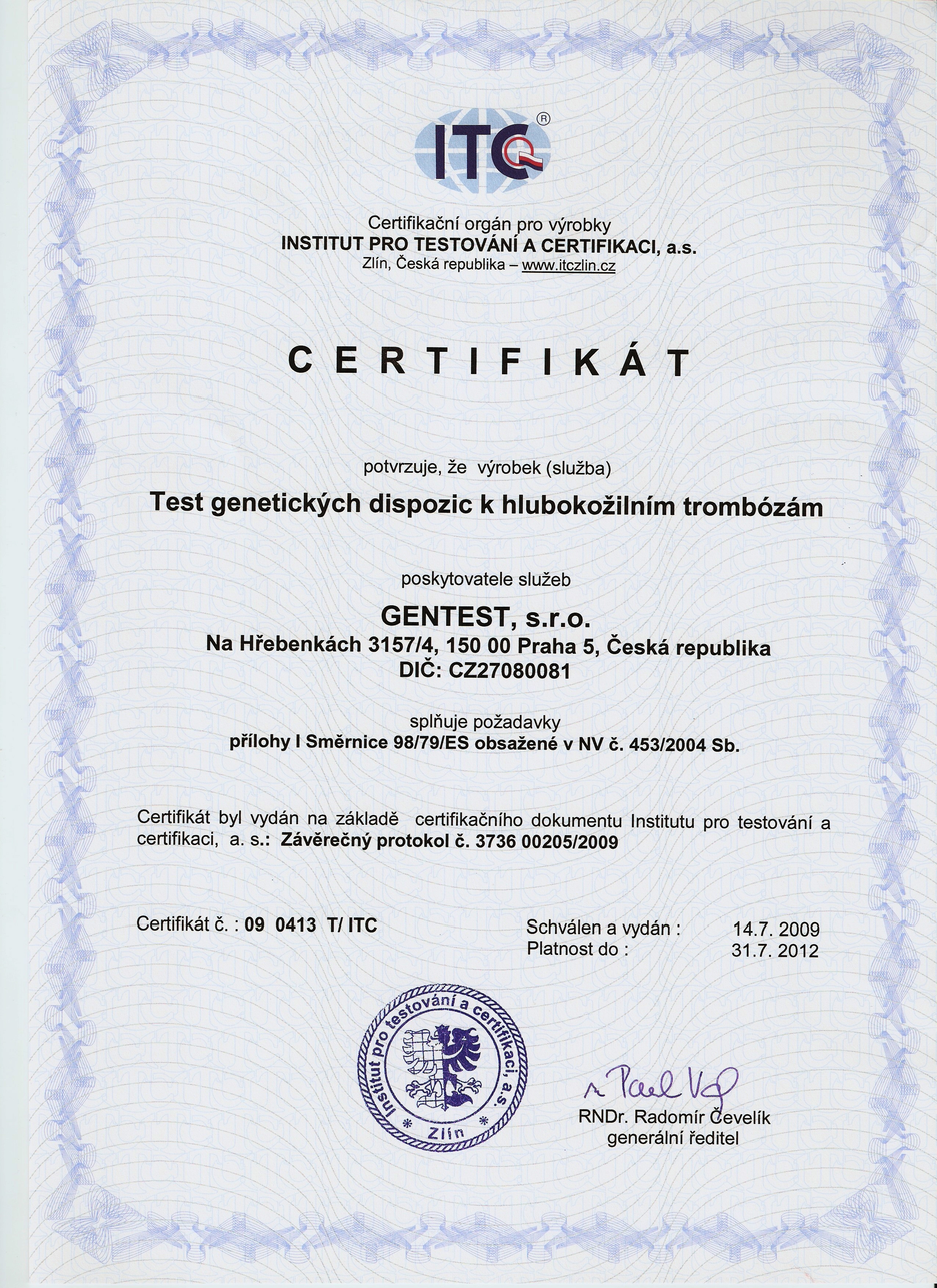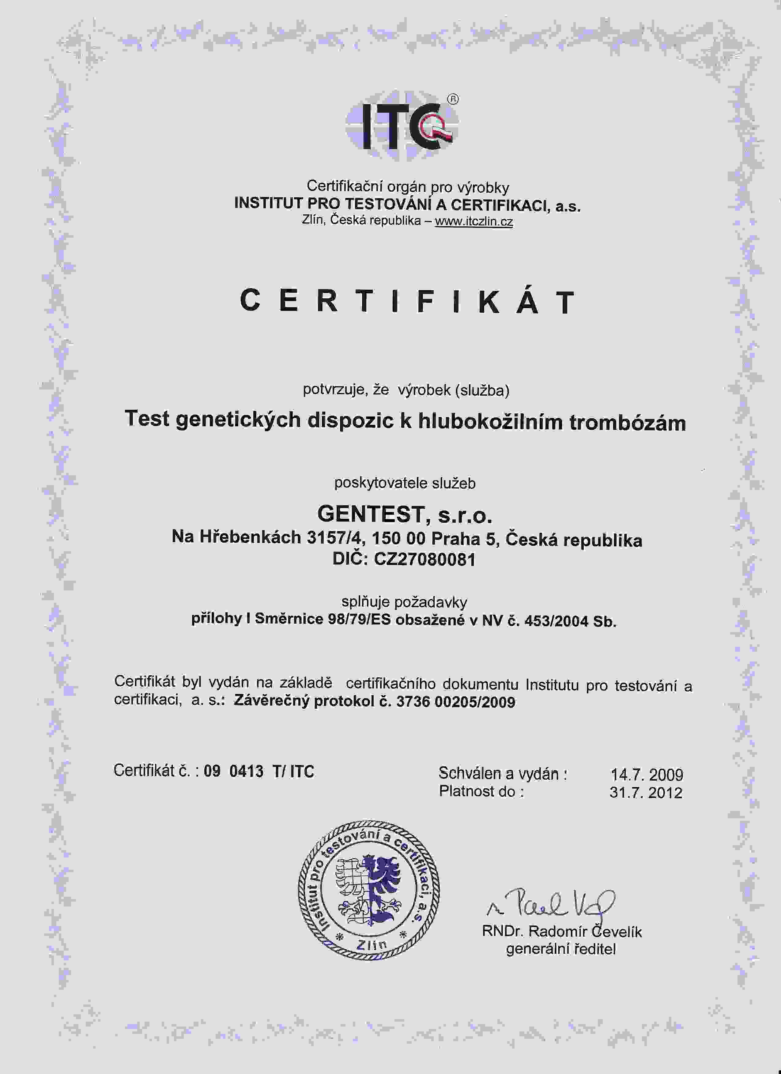 14.7.2009Nezávislá certifikační autorita, tzv. Notifikovaná osoba, opět vydala Certifikát stvrzující, že test genetických dispozic k hlubokožilním trombózám firmy GENTEST s.r.o. splňuje legislativní požadavků EU a doporučení WHO (tj. evropských směrnic č. 98/79/ES a č. 93/42/EHS).