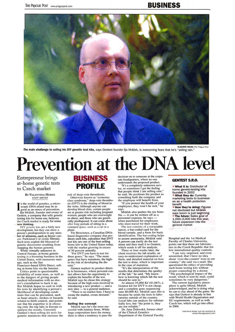 9.8.2006Vydáno potvrzení o tom, že firma GENTEST s.r.o. byla první a zatím i jediná česká firma, která úspěšně prošla náročným certifikačním procesem pro službu genetického testování, a disponuje certifikátem, který byl vydán nezávislou certifikační autoritou, tzv. Notifikovanou osobou. Tento certifikát zaručuje maximální možnou spolehlivost výsledku testu a splnění doporučení WHO a legislativních požadavků EU (tj. evropských směrnic č. 98/79/ES a č. 93/42/EHS).